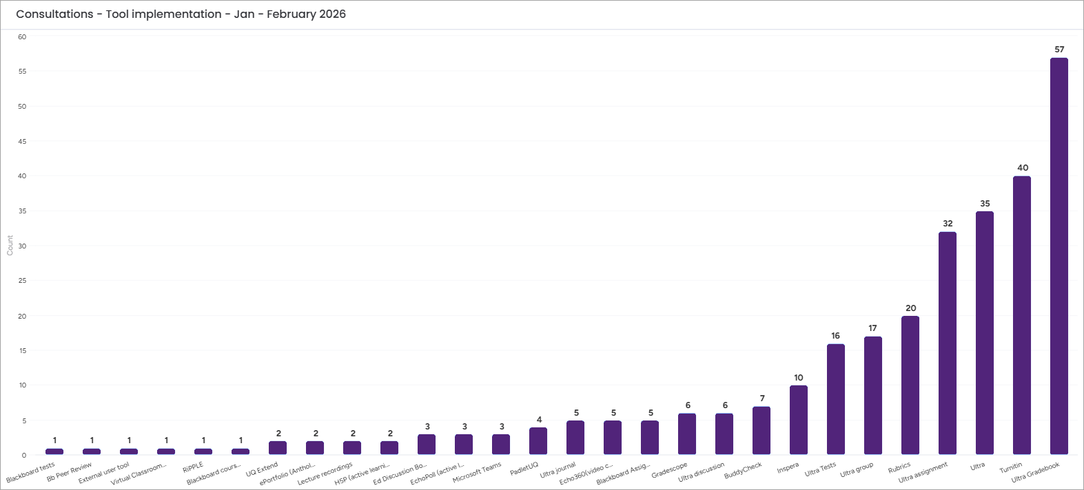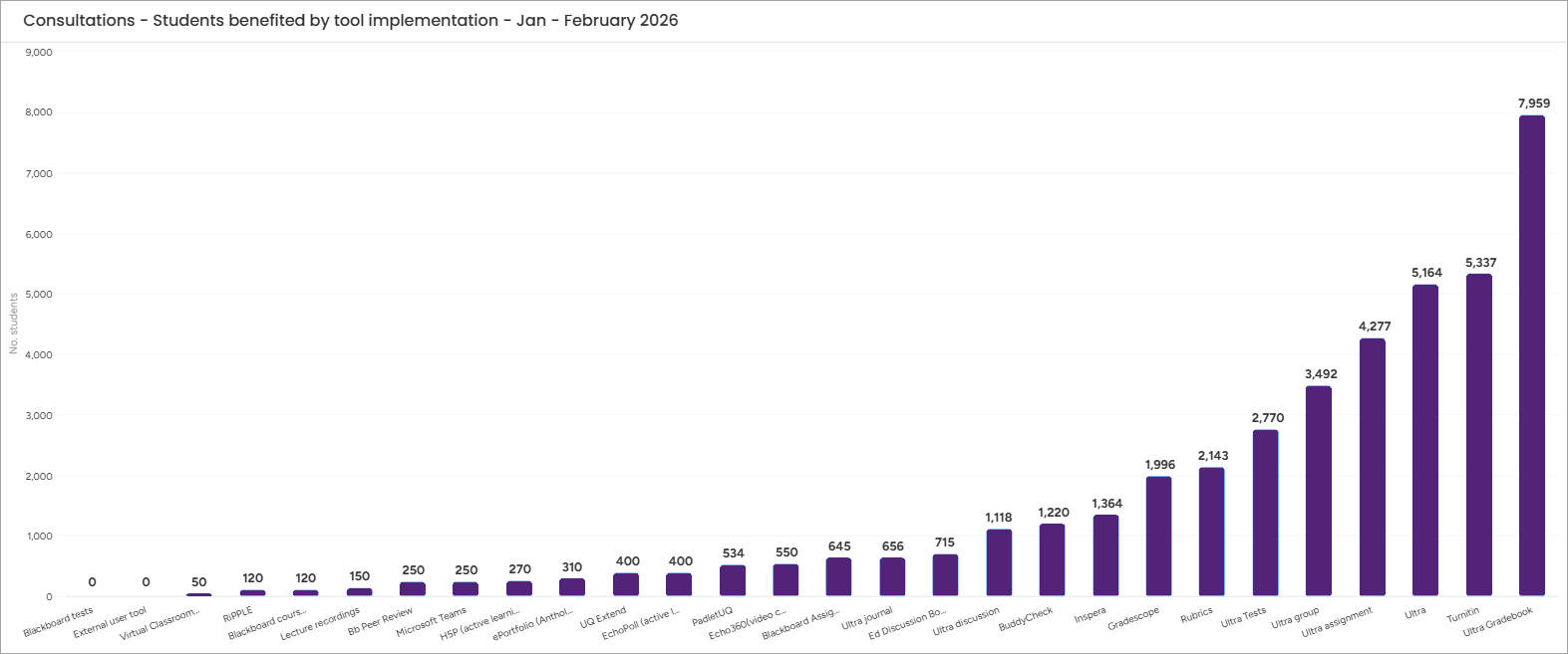 In February, eLearning advisers provided 84 appointments to help courses adopt eLearning technology. The eLearning Adviser Consultations to date in 2026 have catered for 101 Course Coordinators teaching into 132 courses, which constitute approximately 3.8% of all courses in the university and servicing a total of 14,996 student experiences across the university. In total, the number of appointments equals 136. The top three most common individual tools implemented are Ultra Gradebook, Turnitin and Ultra general skills.