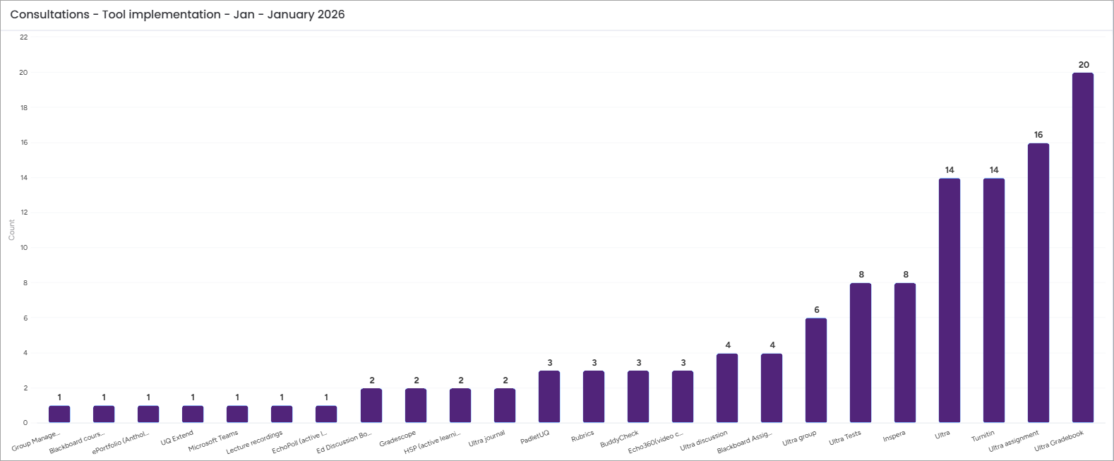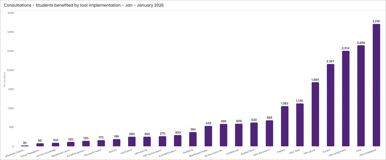 In January, eLearning advisers provided 52 appointments to help courses adopt eLearning technology. The eLearning Adviser Consultations to date in 2026 have catered for 44 Course Coordinators teaching into 63 courses, which constitute approximately 1.7% of all courses in the university and servicing a total of 6,295 student experiences across the university. In total, the number of appointments equals 52. The top three most common individual tools implemented are Ultra Gradebook, Ultra general skills, and Ultra Assignment.