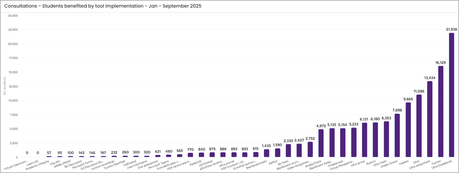 In September, eLearning advisers provided 102 appointments to help courses adopt eLearning technology. The eLearning Adviser Consultations to date in 2025 have catered for 360 Course Coordinators teaching into 469 courses which constitute approximately 12.8% of all courses in the university and servicing a total of 59,285 student experiences across the university. In total, the number of appointments equals 554. The top three most common individual tools implemented are Ultra Gradebook, Turnitin, and Ultra Assignment.