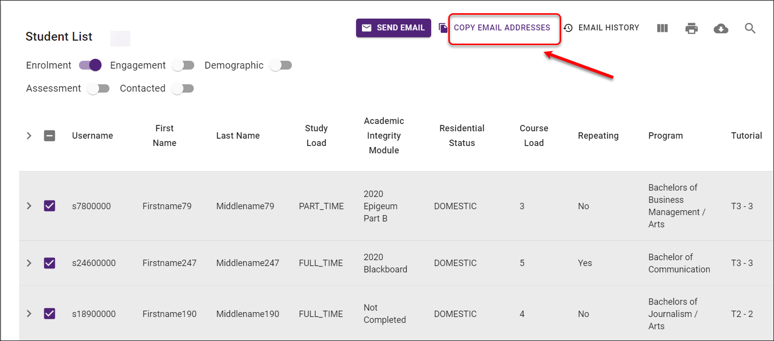 - Click on the COPY EMAIL ADDRESSES button if you would like to copy the email addresses to your clipboard and email students in your preferred email client.