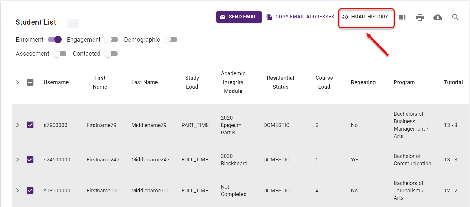 Any emails sent through Course Insights will be recorded and can be viewed by clicking on the Email History button.
