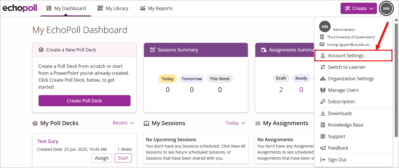 - Your EchoPoll dashboard/web environment will be displayed. Click on the profile icon (it has your initials).